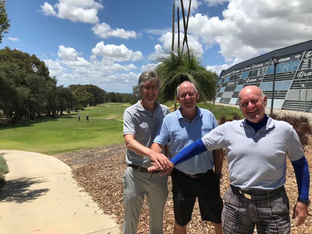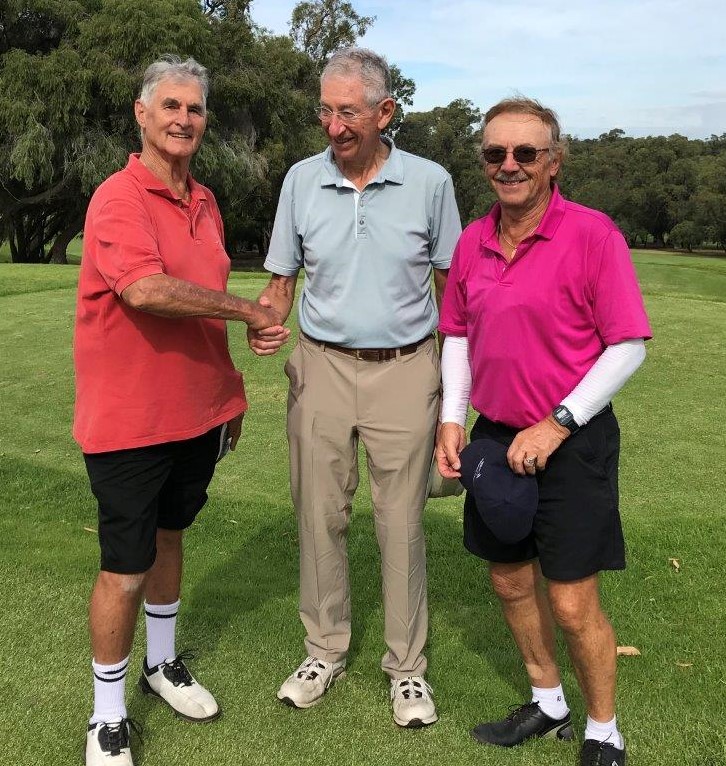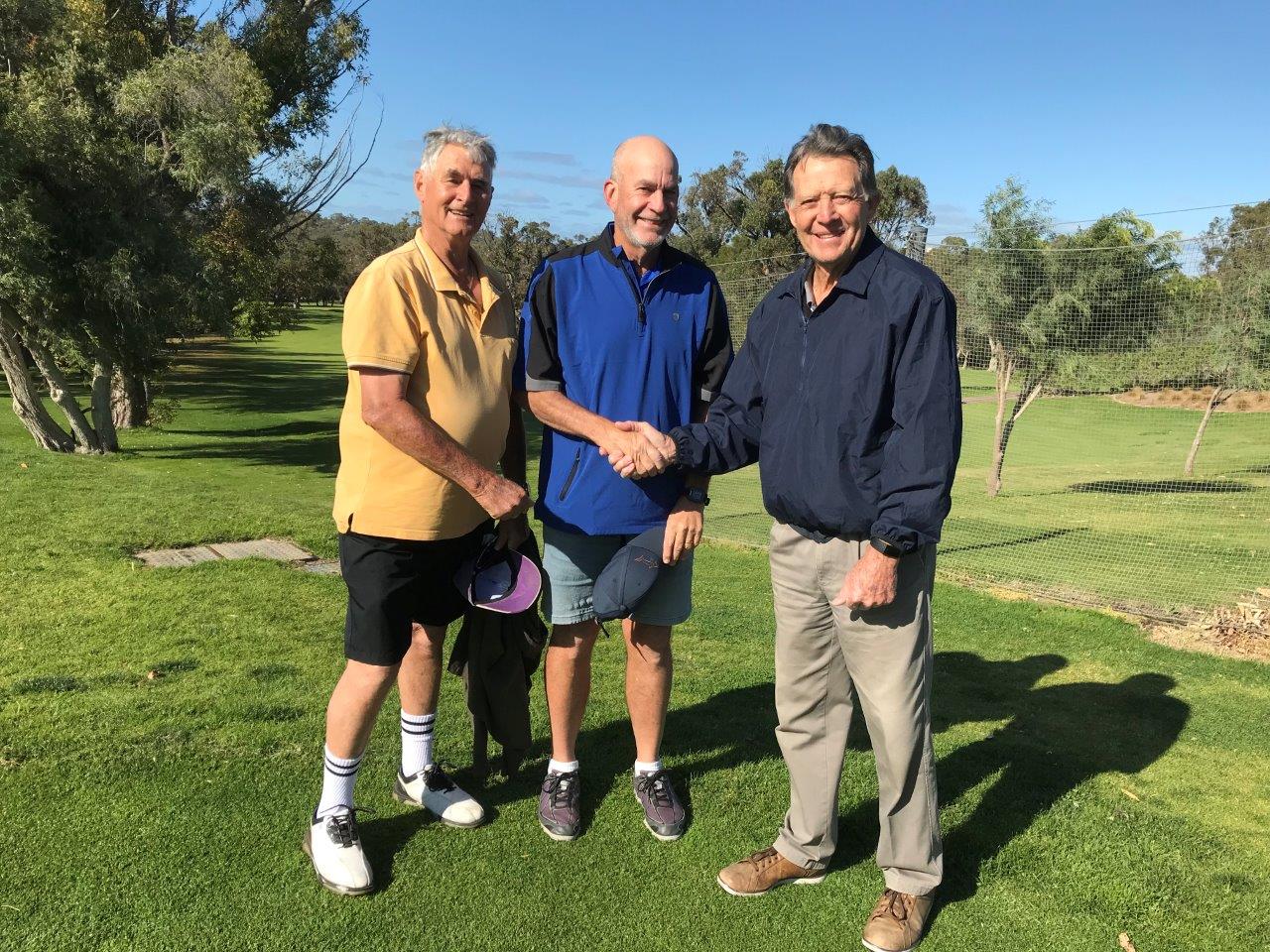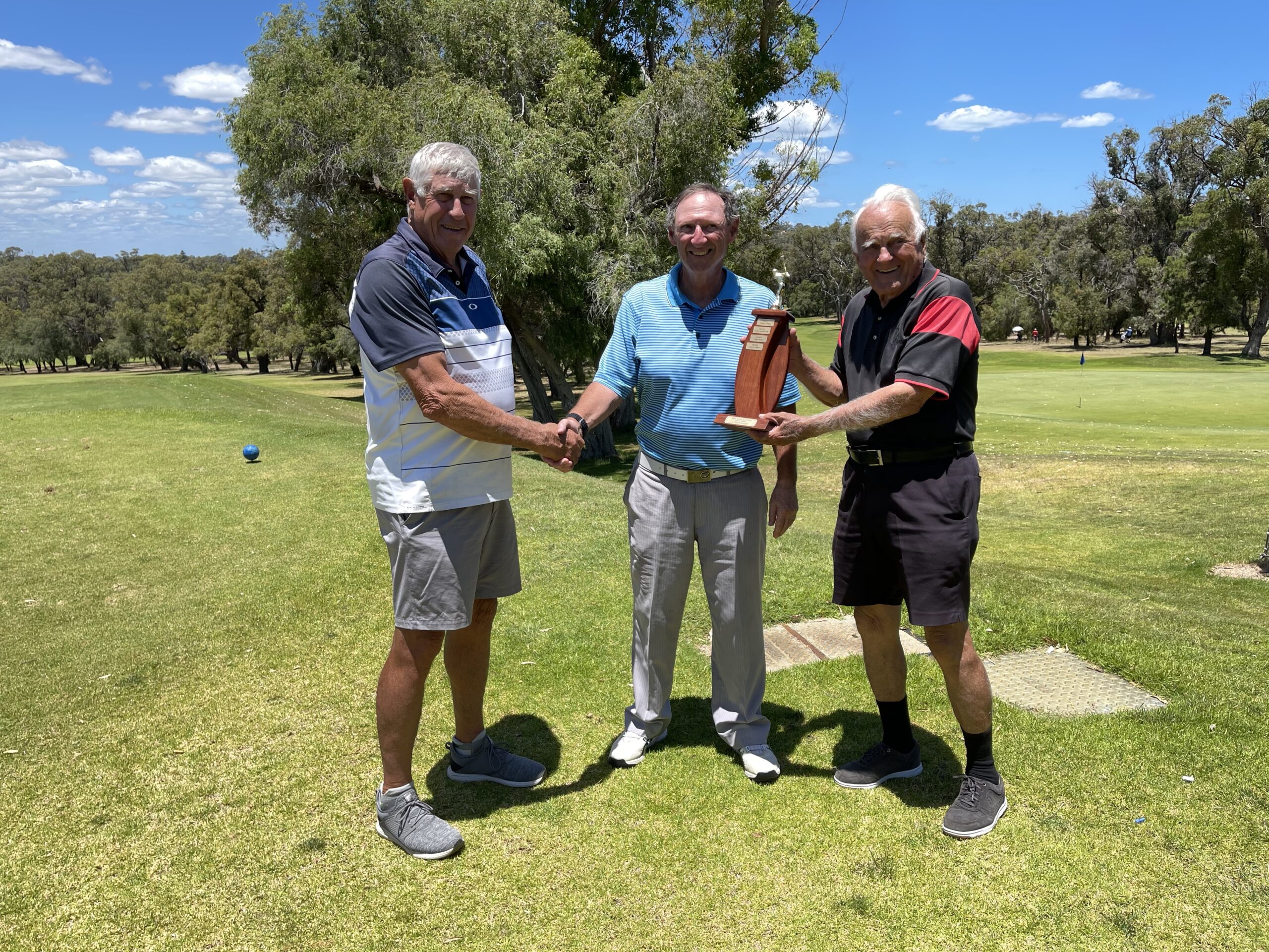 The Cecil McPhee Perpetual Trophy (commonly known as the Cesspot) was won on 6 August 2021 by Carl Colli with a score of 33 points, using medal stableford scoring. It was won on a count-back from Ron Bensky. Carl Colli also had the best gross for the day – 83 strokes. Twenty-two players competed for the trophy on the Tuart Course, on a beautifully sunny day. In the photo, captain Mike Spencer congratulates the winner, Carl Colli supported by the runner-up, Ron Bensky: