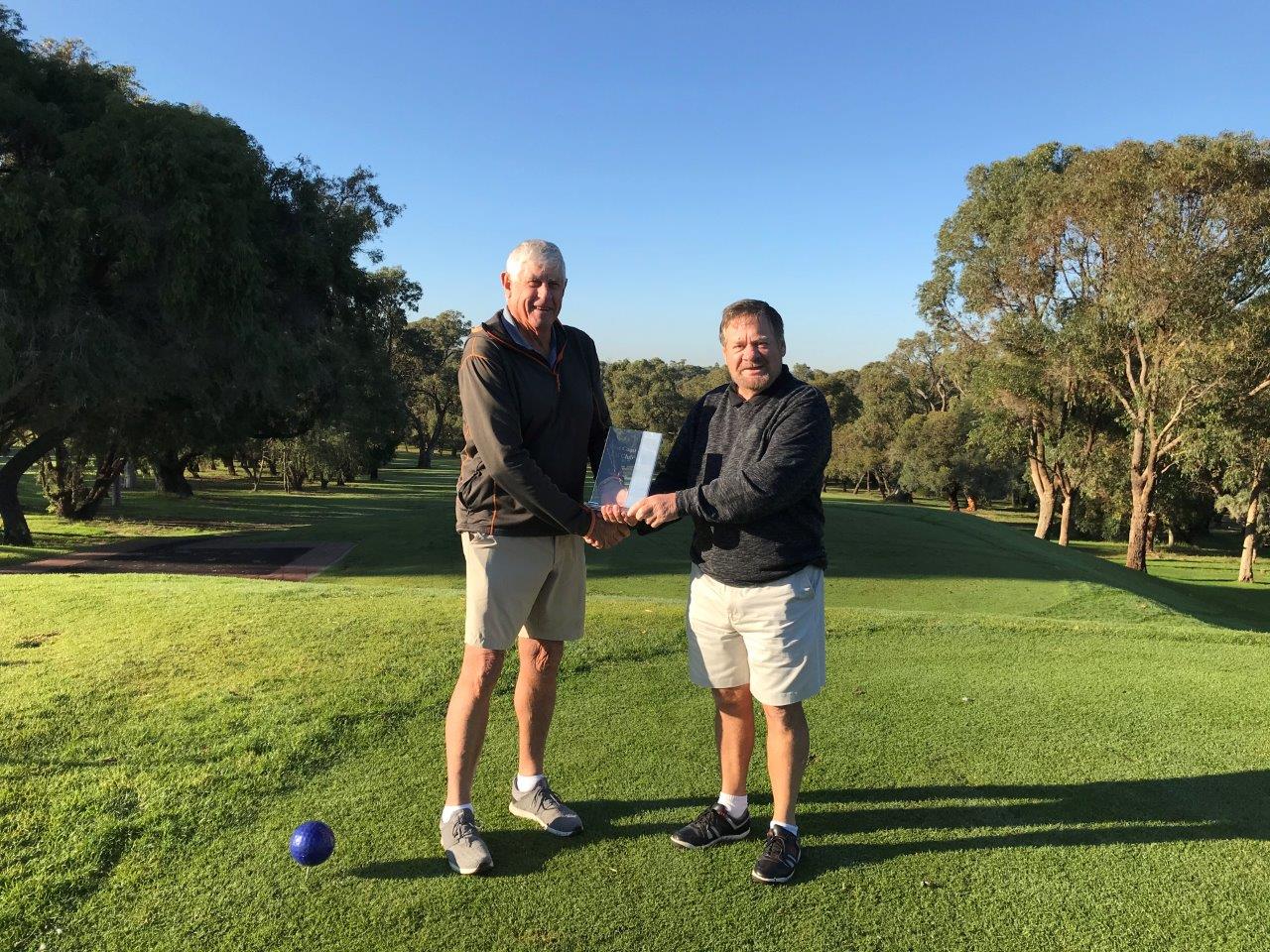 The inaugural President’s Trophy was played on the Old Course at Wembley on Friday 21 May 2021 as a stroke competition in beautiful autumn sunshine – perfect golf conditions for the 19 members who competed. The competition was won by Steve Huckle with a gross of 93 giving a net score of 71. Second was Ron Bensky with a gross of 92 and a net of 72, and third place went to Grant Saunders gross 95, net 75. The best gross for the day went to Jeff Salant with 85, whilst Steve Huckle had the best nine with 22 points. John Campbell achieved the longest drive on the 10th hole, and the closest-to –pin on the par threes were Bruce Morrison, Mike Spencer, Ric Haddleton and Garth Irvine. The photo shows the President Richard Russell (left) presenting his newly-created perpetual trophy to Steve Huckle: