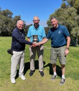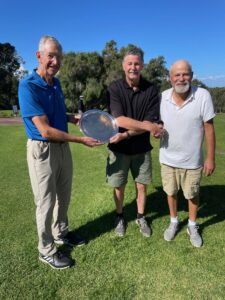 The match play championship was played on Mondays 28 April, 5, 12 and 19 May 2025. The number of members entering the competition was disappointingly less than usual and the timing of the match play will be reconsidered for 2026. However that is not to detract from the performance of the entrants and in particular the winner Alan Smith who takes the Jock Oehlers Shield home for the 5th time – he first won the event in 2005 and to win it again 20 years later aged 87.9 is truly creditable. Ron Bensky provided stiff competition in the final with the pair even after 17 holes and Alan winning by a single putt on the par-3 18th hole. In the photo, Alan is presented with the shield by captain Tom McClain with Ron Bensky on right. The match play ladder is attached.