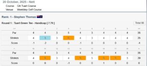 Refer attached results summary and below is a photo of our three champions l-r Stephen Thomas, Graham Guy and Alan Sherman, and a screenshot of Stephen’s card for today’s round. Congratulations to all three: