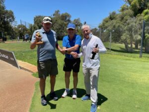 (l-r) Richard Russell with Fergus, club president David Hayes, and monthly medal winner Stephen Thomas