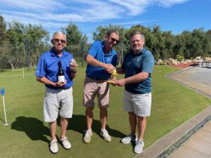 A contrast of happiness and regret – Garth holding the bottle of red wine kindly donated by Graham Guy to the winner of the monthly medal – Garth’s net score of two under par 70 won him the bottle.  By contrast, Steve Huckle and Peter Warschauer are holding the Fergus McDuff trophy for the worst putting performance on the day – 37 putts each by comparison to David Lynn’s 26 putts for 18 holes, the best putting performance for the day.