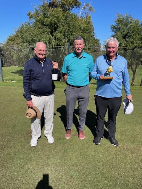 Graham Guy was presented with a bottle of red wine donated by himself as the winner of the September monthly medal stroke competition.  He scored 90 off the stick, net 70, with 5 pars, 8 bogeys and only 5 double-bogeys or worse.  His fairway work was very accurate because he came close to winning the Fergus McDuff trophy for the worst putting in the competition, with 39 putts.  However, he was saved having to keep the trophy until the next stroke & putts competition by Ray Parry who also chalked up 39 putts but did so on the back nine and hence collected the trophy on count-back.  Best putts were shared by Tony Fisk and Tom McClain with 31 each. The photo will remind both Graham (left) and Ray (right) of the need to improve their putting whilst Captain Tom McClain (centre) could perhaps give them a few tips.